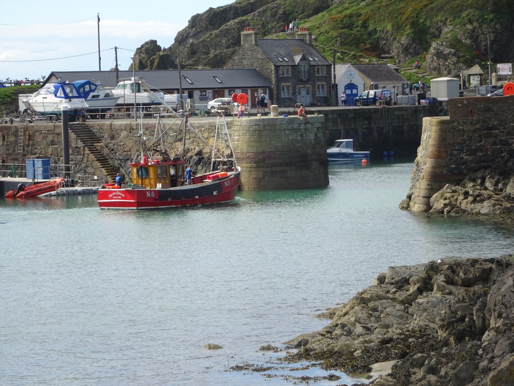 For my first day in Portpatrick (Dumfries and Galloway) it was pouring down on the way up, especially through the lakes, but when I got within about 15 miles of Portpatrick, it stopped, became and remained blue sky for the rest of my holiday. As can be seen from the featured image my hotel was on top of the cliffs above Portpatrick Harbour. I walked my little Norfolk Terrier dog, Maisie, down the steep steps to the harbour at least twice a day. The top of the steps outside of the hotel is the start of the Southern Upland Way, running across 214 miles of varied country and finishing at Cockburnspath on the east, near the coast.